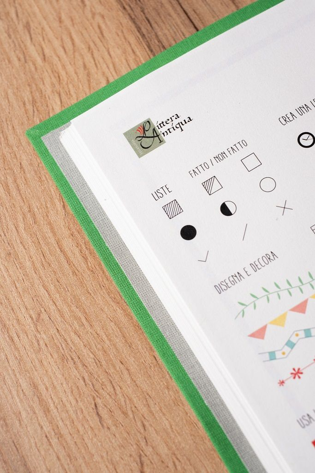 - 1 copertina in tela color verde chiaro con interno grigio e rilegatura Midori