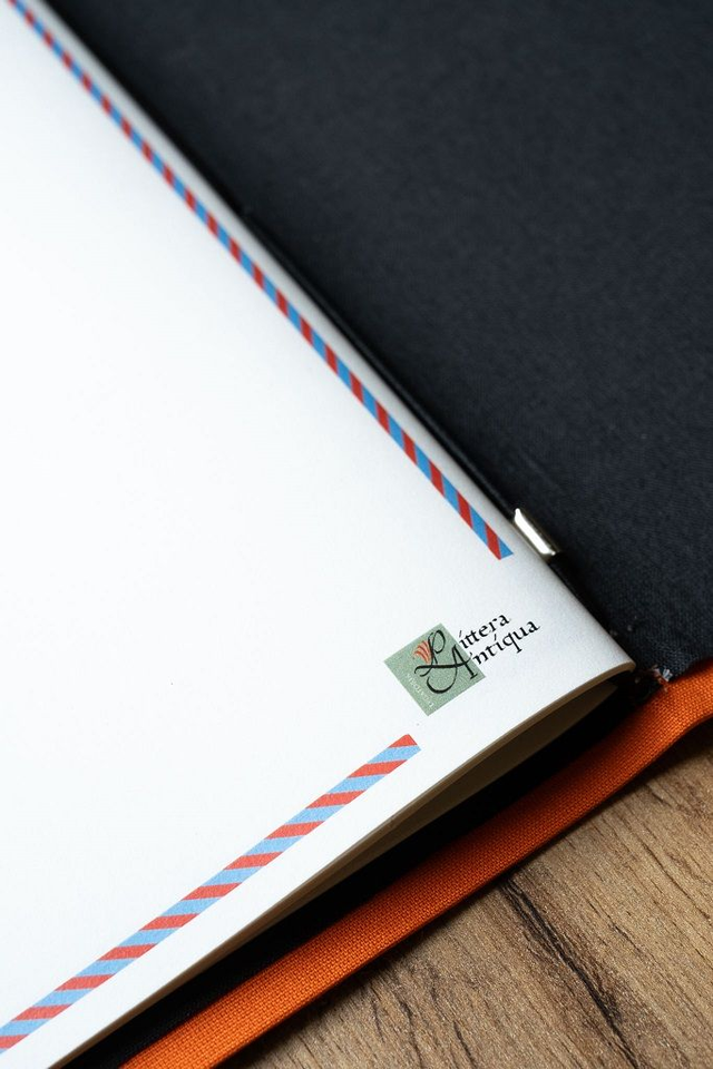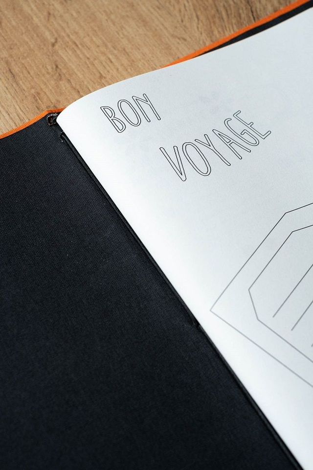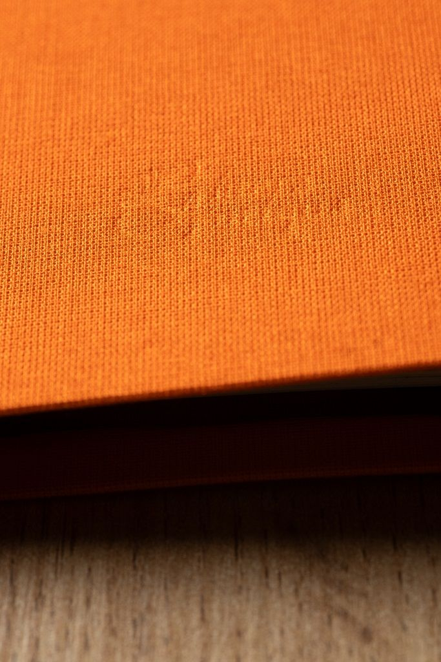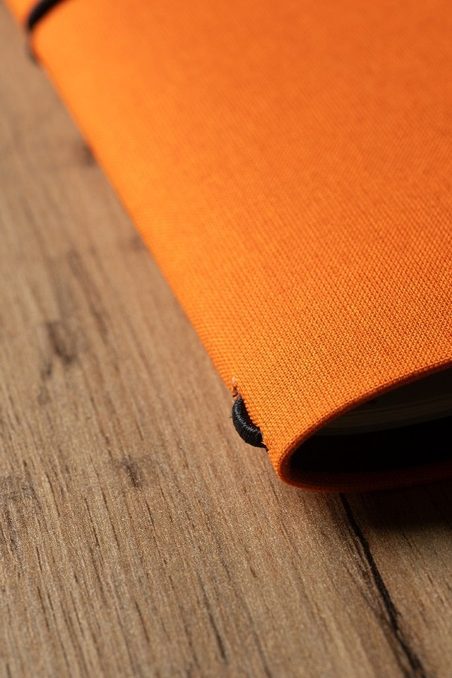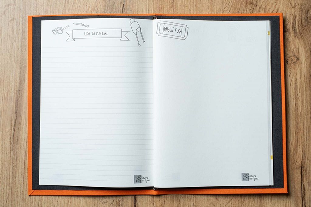 - 1 copertina rivestita in tela color arancio con interno nero e rilegatura Midori per renderlo versatile e per accogliere biglietti, brochure o altri materiali del tuo viaggio