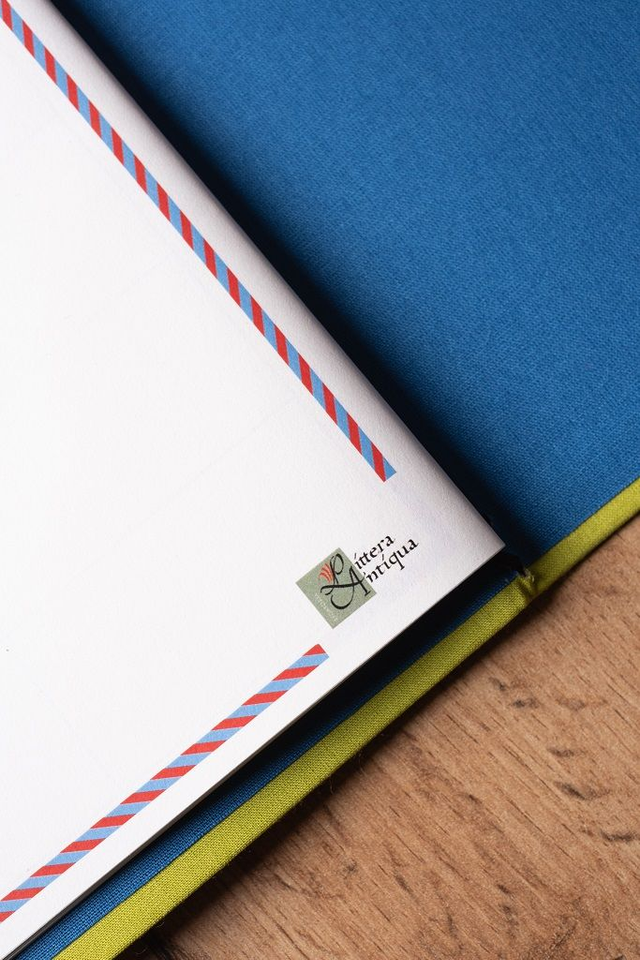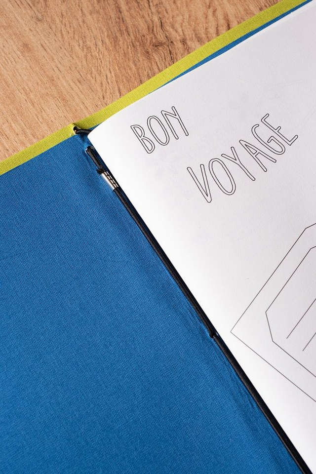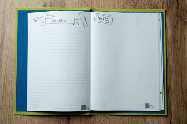- 1 copertina rivestita in tela color lime con interno blu chiaro e rilegatura Midori per renderlo versatile e per accogliere biglietti, brochure o altri materiali del tuo viaggio