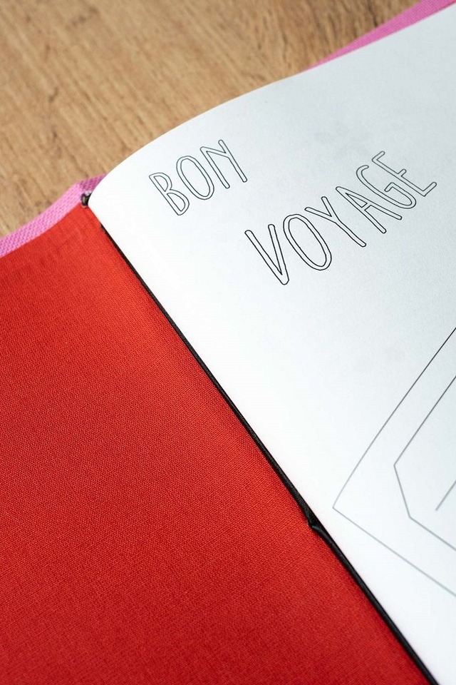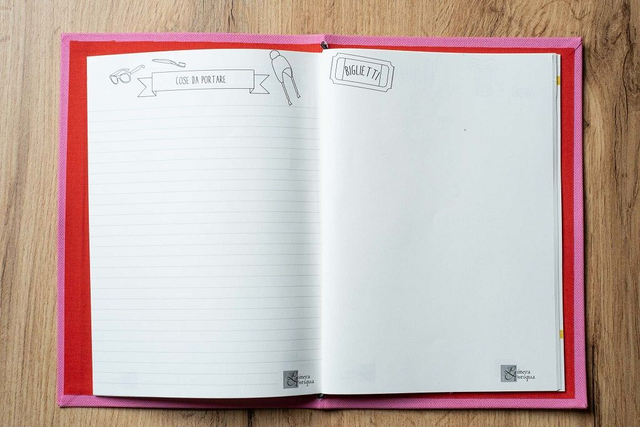 - 1 copertina rivestita in tela color rosa con interno rosso e rilegatura Midori per renderlo versatile e per accogliere biglietti, brochure o altri materiali del tuo viaggio