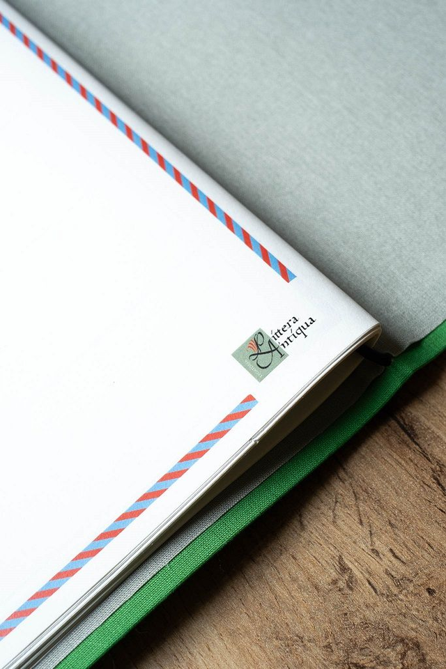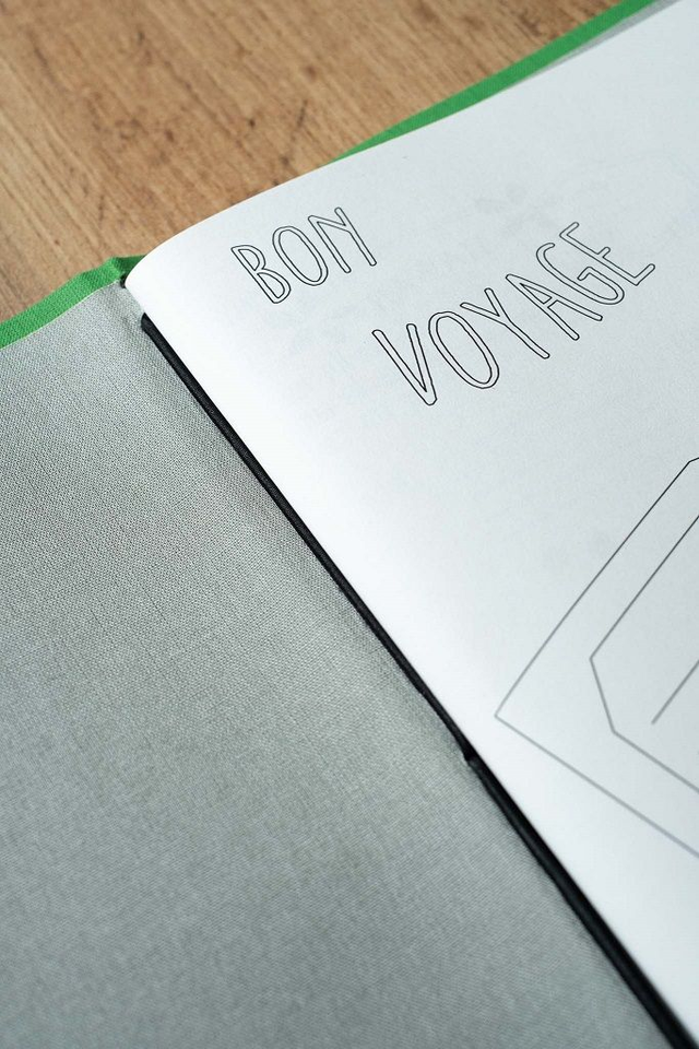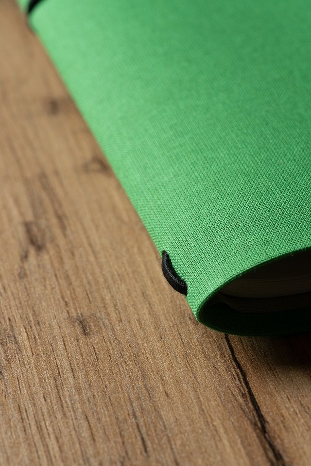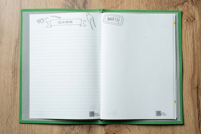 - 1 copertina rivestita in tela color verde chiaro con interno grigio chiaro e rilegatura Midori per renderlo versatile e per accogliere biglietti, brochure o altri materiali del tuo viaggio