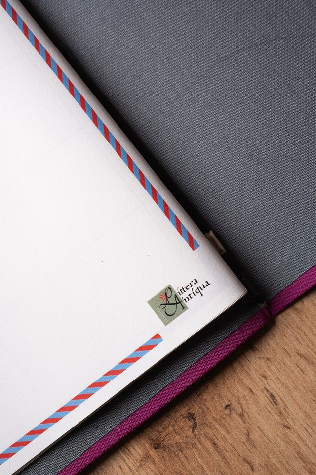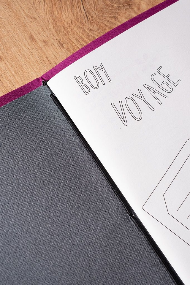 • 1 copertina rivestita in tela color viola con interno grigio e rilegatura Midori per renderlo versatile e per accogliere biglietti, brochure o altri materiali del tuo viaggio