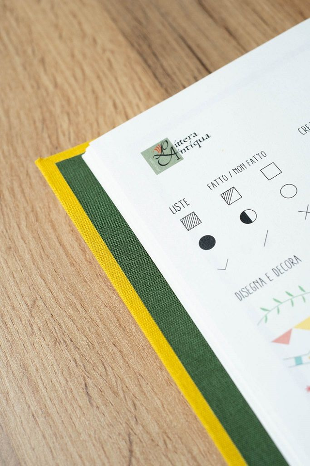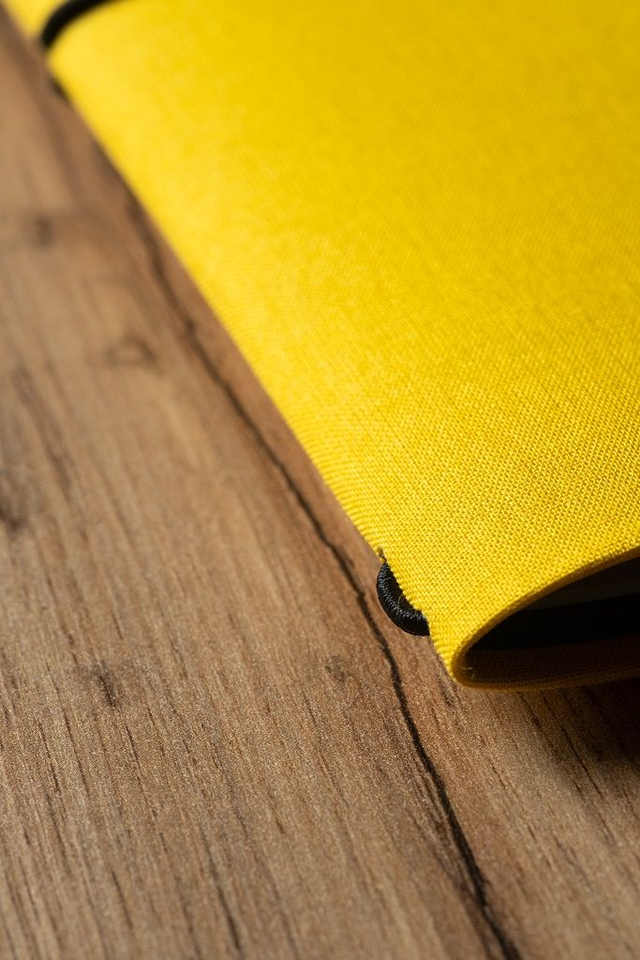• 1 copertina in tela color giallo con interno verde scuro e rilegatura Midori