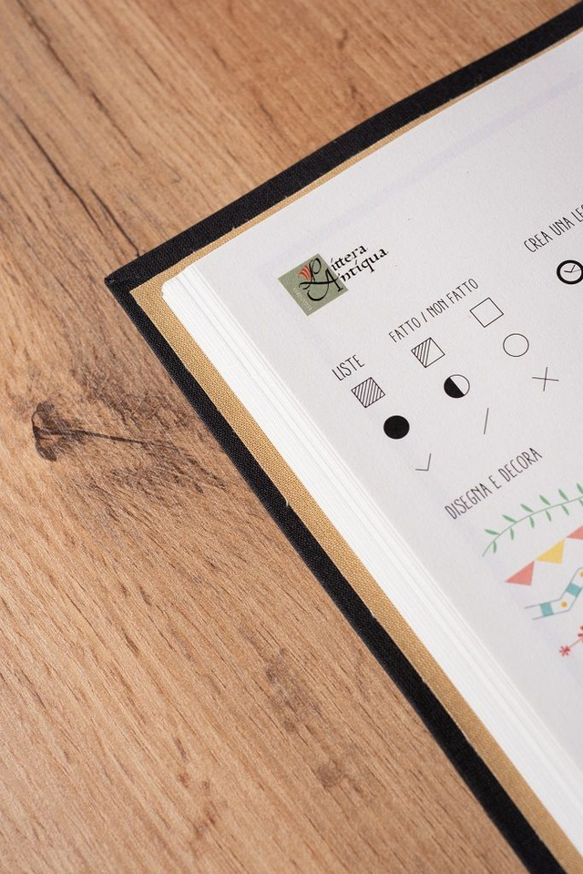 - 1 copertina in tela color nero con interno senape e rilegatura Midori
