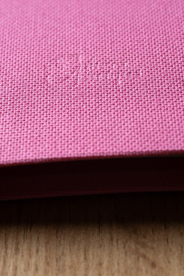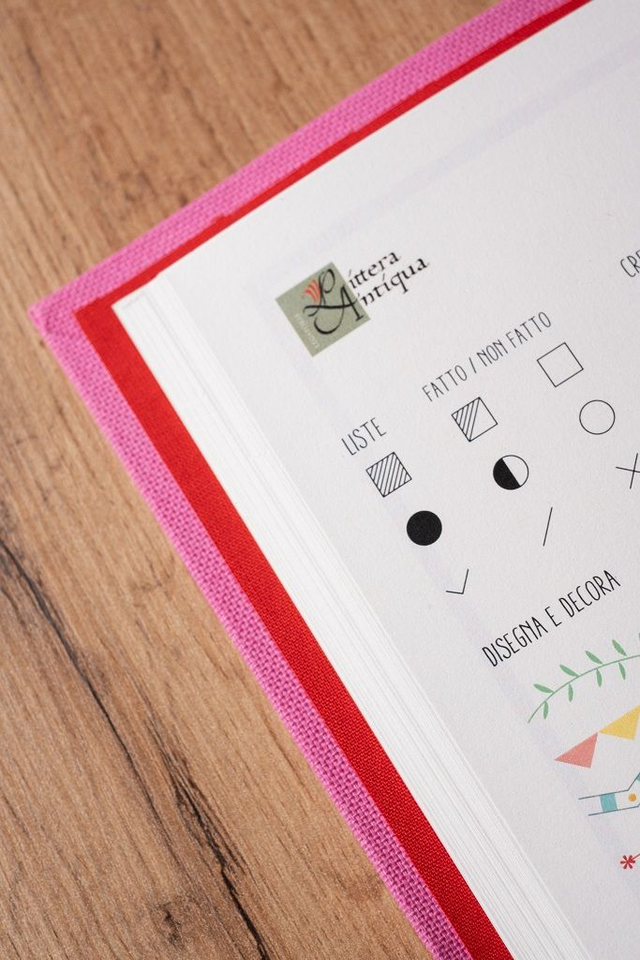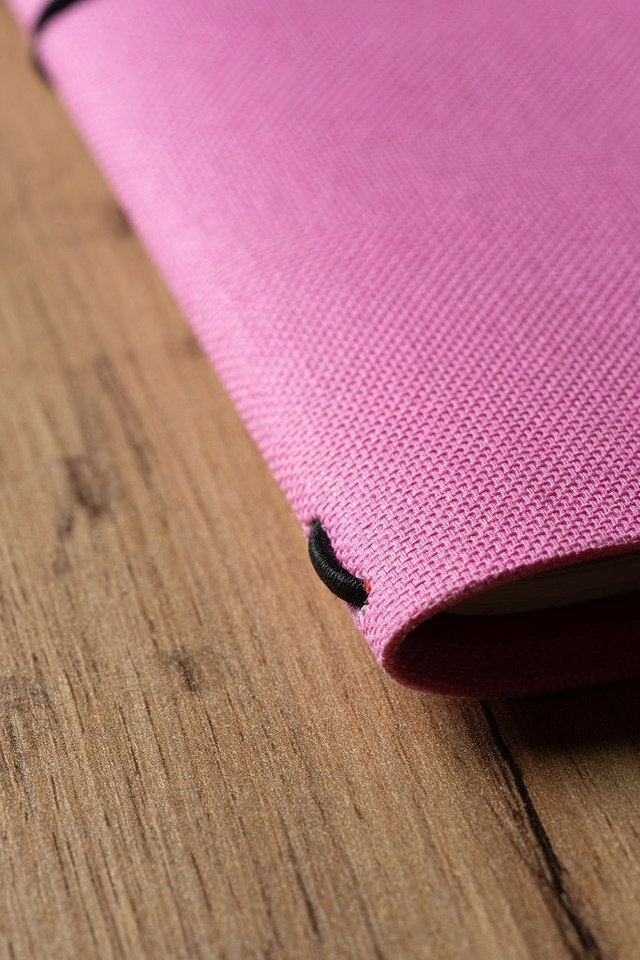 - 1 copertina in tela color rosa con interno rosso e rilegatura Midori