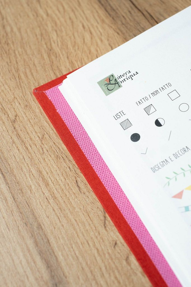 - 1 copertina in tela color rosso con interno rosa e rilegatura Midori